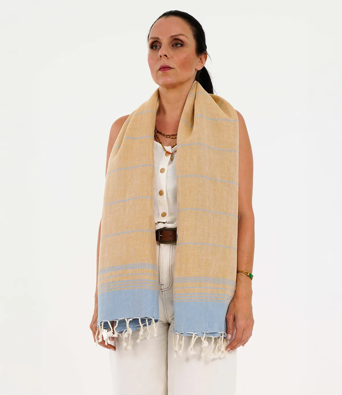 Πετσέτα Πεστεμάλ. Ελαφριά, απορροφητική, με μικρό όγκο, στεγνώνει γρήγορα με χρήσεις τόσες, όσες μπορεί να φανταστεί κανείς, στην καθημερινότητα και τις διακοπές. Μουσταρδί / Γαλάζιο PEACE