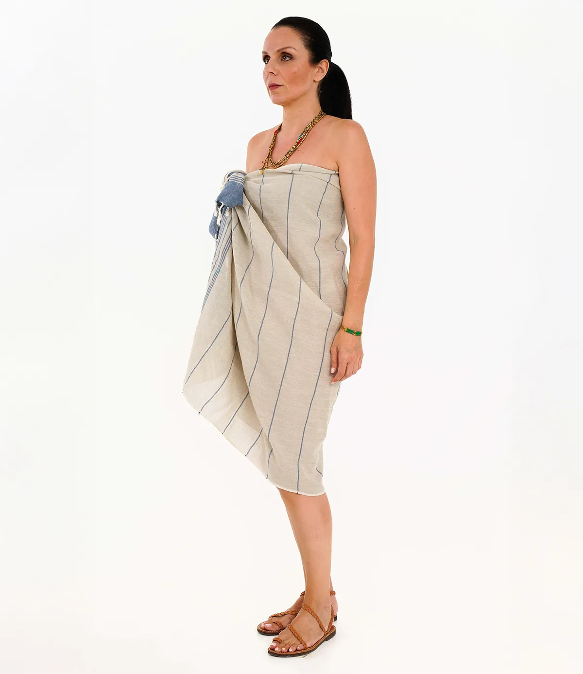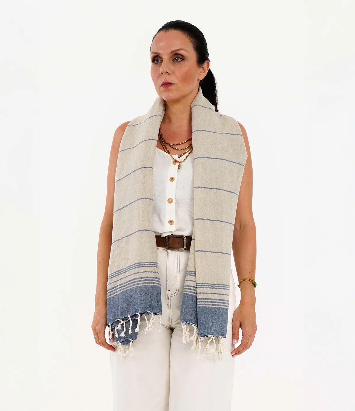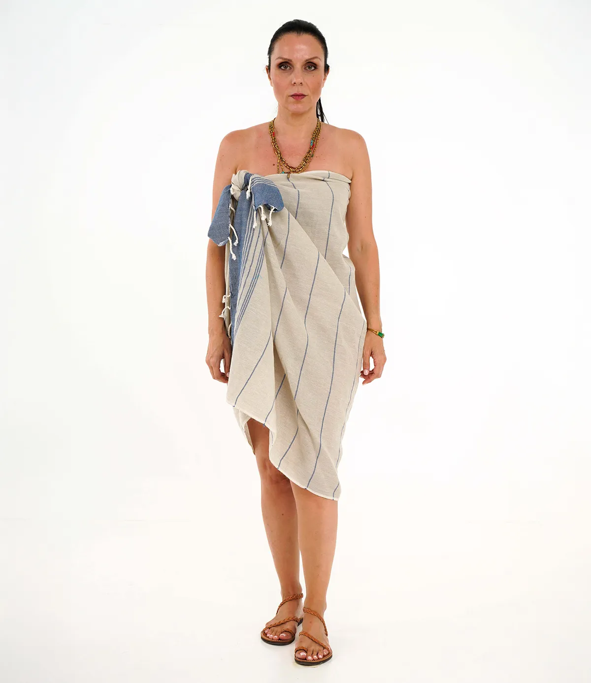 Πετσέτα Πεστεμάλ. Ελαφριά, απορροφητική, με μικρό όγκο, στεγνώνει γρήγορα με χρήσεις τόσες, όσες μπορεί να φανταστεί κανείς, στην καθημερινότητα και τις διακοπές. Μπέζ / Μπλέ PEACE