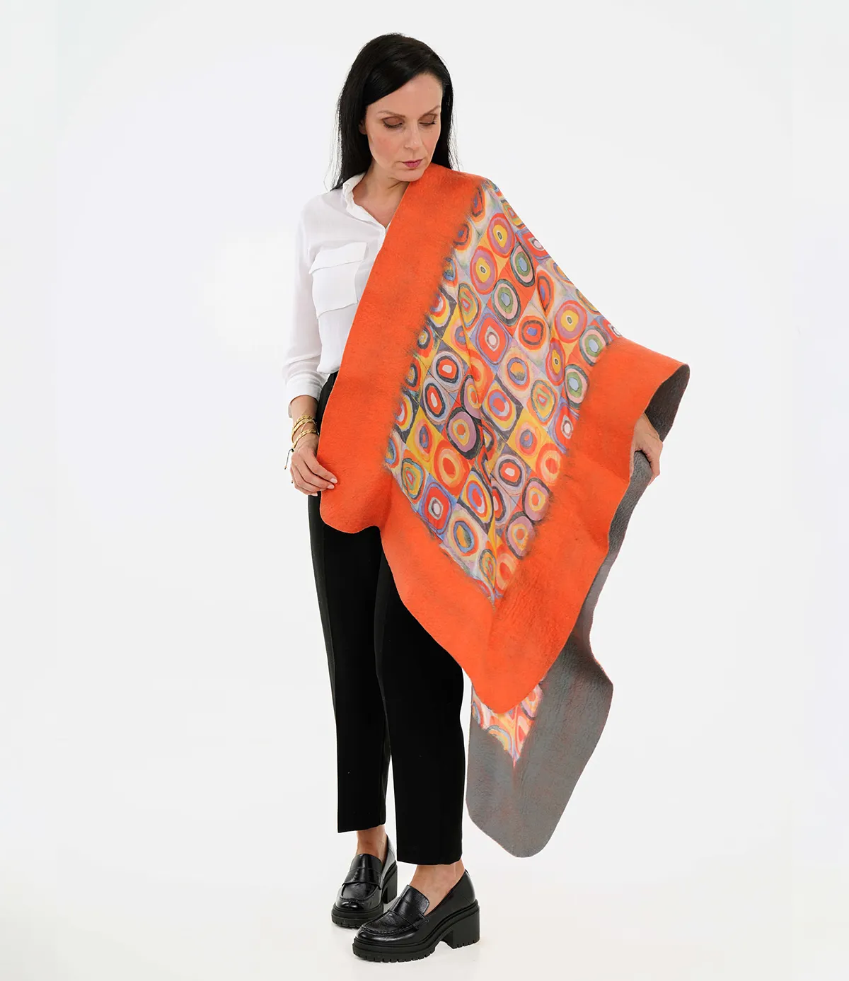 Σάλι, Διπλής Όψης, Πορτοκαλί / Γκρί Τσόχα, Σχέδιο Τετράγωνα, Κύκλοι Πολύχρωμοι Kandinsky Μετάξι